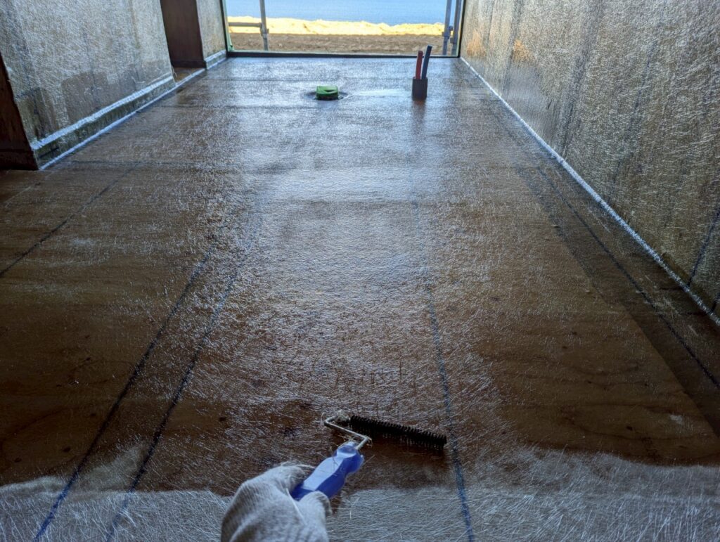 ガラスマットにFRP樹脂を塗り込んでいきます。
